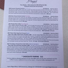 Customer reviews consistently praise August Briggs for its exceptional wines, with favorites including the Ancient Vines Zinfandel, Malbec, and Pinot varieties. The wine tasting experience is enhanced by the option to pair wines with delectable chocolates, creating a unique and memorable flavor combination. Visitors appreciate the extensive knowledge and friendliness of the staff, particularly mentioning hosts like Colette and Matt for their attentive service.